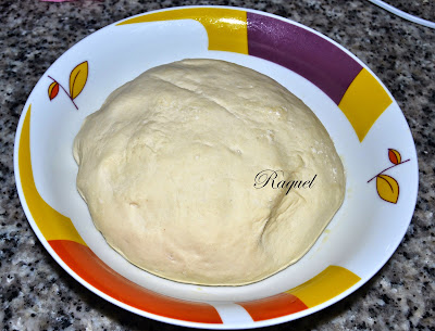 Volvemos a espolvorear el mármol con harina y volveremos otra vez a amasar la masa, hay que quitar el exceso de gas que se ha formado aplastando y presionando con los puños, después estiraremos la masa con un rodillo hasta que quede bien fina y le damos la forma deseada yo en forma ovalada, sobre una bandeja ligeramente untada con aceite de oliva ahora ponemos trozos pequeños de queso curado todo alrededor de los bordes y le hacemos un doblez hacia dentro y lo aplastamos con los dedos .