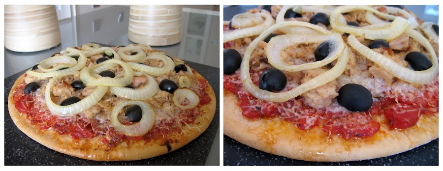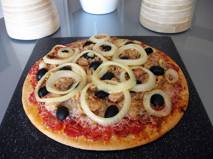 7) Escurre el líquido que tengan las dos latas de atún en conserva. Desmenuza el atún y distribúyelo por la superficie de la pizza. Añade las 10 aceitunas deshuesadas cortadas por la mitad y coloca por encima los aros de cebolla que has sofrito en el paso 2.