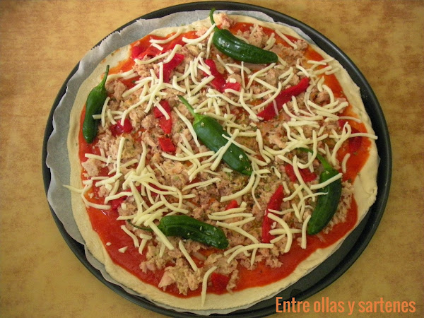 Una vez haya terminado, extendemos la masa en una superficie limpia y enharinada dejándola reposar 10 minutos. Tras los cuales la cubrimos de tomate, el atún escurrido, los pimientos de Padrón y las tiras de pimiento del piquillo. Por ultimo cubrimos de la mozarella rallada y el orégano.