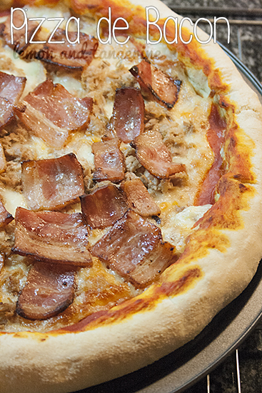 Una vez haya levado precalentamos el horno a 200º, amasamos un poco para desgasificar, esparcimos un poco de harina de maíz en la mesa y en el rodillo para que no se pegue y extendemos la masa con ayuda de un rodillo hasta que nos quede de más o menos uno o dos centímetros de grosor. Si tenemos un molde de pizzas lo colocamos encima y cortamos la masa dejando unos cinco centímetros de diferencia, y colocamos la masa encima. En el borde sobrante colocamos tiras de queso mozzarella, o queso normal, y lo enrollamos bien, apretando los bordes contra la base con un tenedor para que no se abran en el horno, y cubrimos la base con salsa de tomate. Hacemos el primer horneado durante unos diez minutos a 200º con calor sólo abajo, y mientras cortamos el bacon ahumado en cuadrados que salteamos previamente sin aceite para eliminar parte de la grasa y así evitar que la pizza se nos quede aguada. Sacamos la pizza y ponemos sobre el tomate el queso mozzarella, cubriendo bien toda la base, encima el atún bien escurrido y bien esparcido, por encima del atún los cuadrados de bacon previamente salteados, y por último el orégano. Horneamos a 200º ahora con calor arriba y abajo durante unos quince minutos, hasta que veamos que la masa está crujiente levantando un poco la base y comprobando si está hecha. Sacamos del horno, dejamos reposar cinco minutos en una rejilla y lista para degustar.