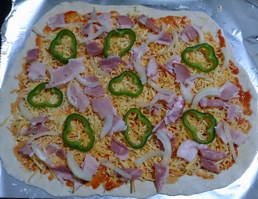 Extender la masa, untar tomate frito y cubrir de queso. Poner trozos de beicon, la cebolla y las rodajas de pimiento.