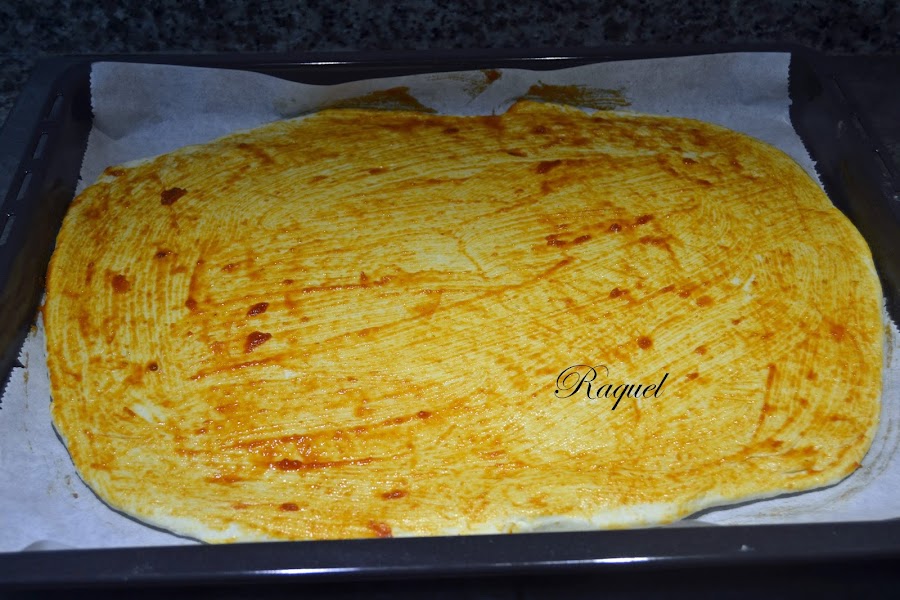 Y la ponemos sobre una bandeja ligeramente untada con aceite de oliva o un papel de horno, pintamos con tomate toda la base.