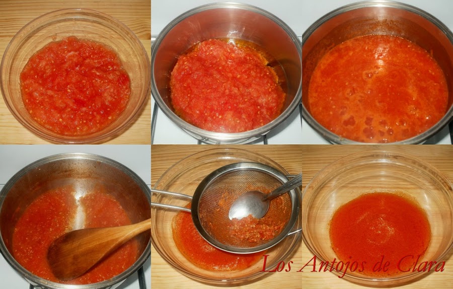 Mientras la masa se está fermentando, preparamos la salsa de tomate o tomate frito. Rallamos los tomates, reservamos su pulpa y desechamos las cáscaras. En una cacerola calentamos 3 cucharadas de aceite de oliva, añadimos la pulpa de tomate, removemos y sofreímos a fuego medio. Sazonamos con un 1/3 de cucharadita de sal, cocinamos la salsa hasta que espese y reduzca a la mitad, si lo prefieren, la pueden dejar aún más espesa o concentrada. No olviden removerla ocasionalmente para que no se agarre al fondo de la cacerola. Una vez que la salsa esté en su punto, la probamos, si hace falta, corregimos la acidez con una pizca de azúcar. Apagamos el fuego y dejamos enfriar a temperatura ambiente. Finalmente, colamos la salsa, presionamos muy bien para que toda la pulpa pase por el colador, en este sólo nos deben quedar las semillas y los restos de cáscara. Reservamos la salsa hasta el momento de montar las pizzas.