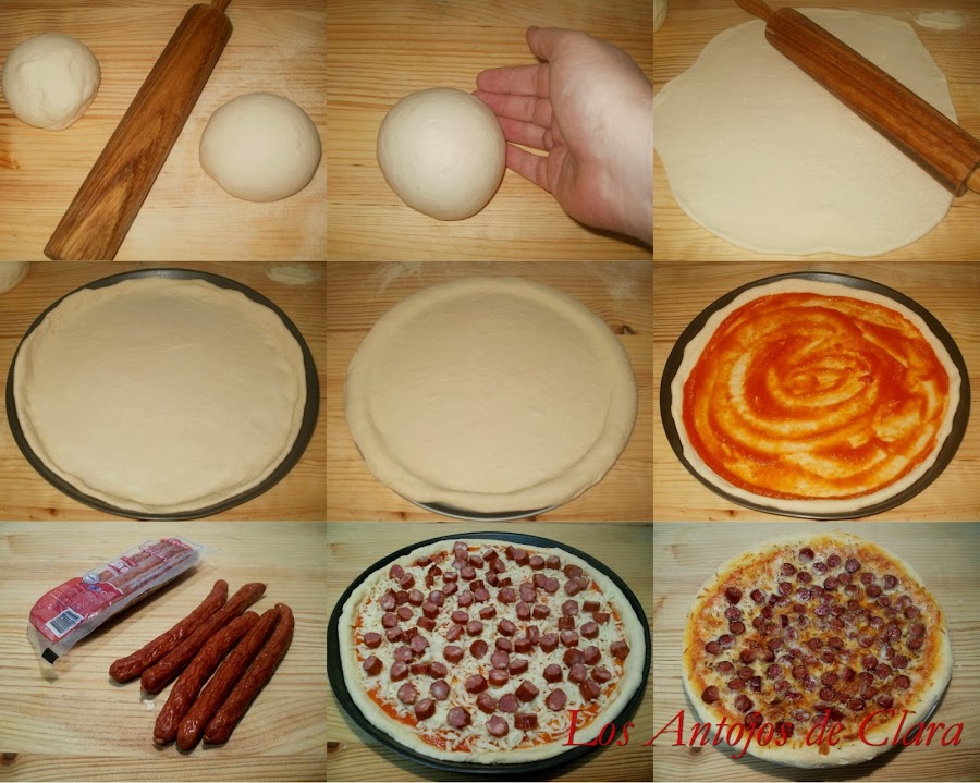 En primer lugar hacemos la masa de la pizza. Colocamos todos los ingredientes en un tazón grande y los mezclamos bien. Comenzamos a amasar en el mismo recipiente para conseguir que la masa se despegue de las paredes. Pasamos la masa a una superficie de trabajo ligeramente enharinada, la plegamos y estiramos con las manos hasta obtener una masa elástica. Este paso puede tardar unos 10 minutos. Cuando la masa alcance la textura deseada, formamos una bola y la colocamos en el tazón, cubrimos con papel film y dejamos fermentar hasta que duplique su volumen. Este proceso puede tardar una hora. La fermentación debe hacerse en un lugar cálido libre de corrientes de aire frío.