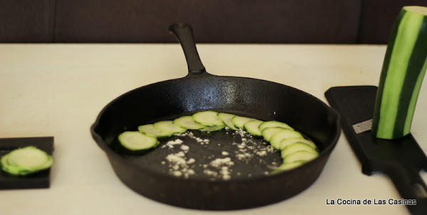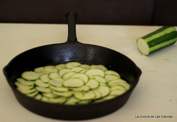 Distribuye en círculo las láminas de calabacínñ, yo lo he hecho en esta sartén que he pincelado con aceite y espolvoreado de harina para que no se pegue. Si no tienes una sartén apta para el horno, hazlo en la bandeja de horno que has cubierto de papel vegetal.