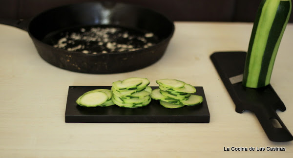 Lava y pela el calabacín haciendo tiras, no por nada, si no porque me gusta como queda, jejejej. Corta en lonchas finas, yo lo he hecho con la mandolina, quedan perfectas.