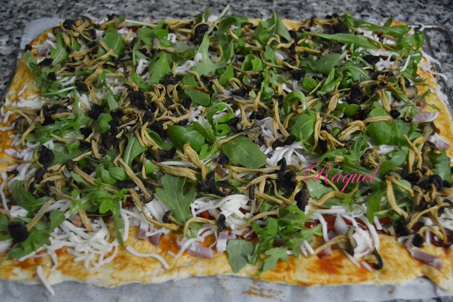 Hoy traigo esta pizza nueva en mi repertorio de pizzas, ya el otro día os avance la receta de la masa italiana y parece que os ha gustado tanto como a mi, esta masa de pizza es especial es de una receta que me han dado realmente italiana y lleva un poco de miel, si miel suena raro pero da un punto exquisito de sabor, tenia muchas ganas de preparar una pizza que llevara canónigos y estas deliciosas setas camagrocs y aquí esta.