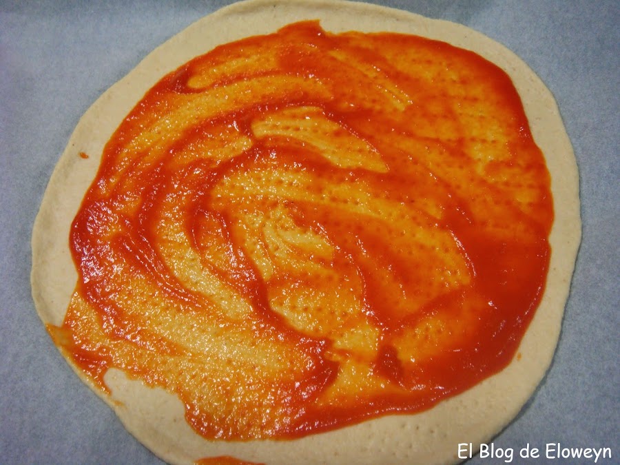 Poned un poco de tomate en el centro y extended hacia los bordes. Si os falta tomate, volved a poner tomate en el centro e ir extendiendo hacia los bordes.