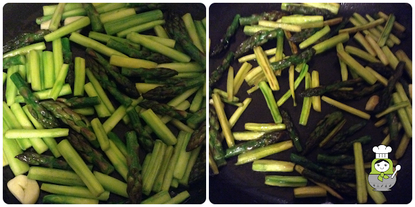 Lavamos bien los espárragos y les quitamos la parte dura del tallo, después los pelamos desde la yema hasta el final con ayuda de un pelador. Para que estén blanditos, los vamos a pochar durante una media hora en una sartén a fuego bajo con una cucharada de aceite de oliva y un par de dientes de ajo aplastados y sal. Cuando estén blanditos, los reservamos.