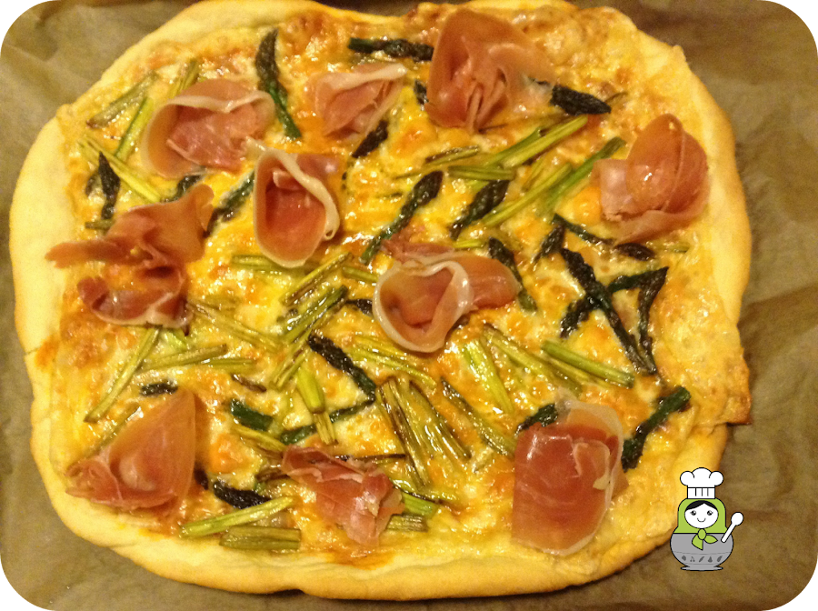 Los espárragos están de temporada y a nosotras nos encantan así que aprovechamos cualquier excusa para comerlos. Hoy nos hemos decidido por una pizza con ellos y con un buen jamón serrano, una combinación que nunca falla. Si estáis pensando en un viernes o sábado de pizza y peli, apuntad la receta, no os defraudará.