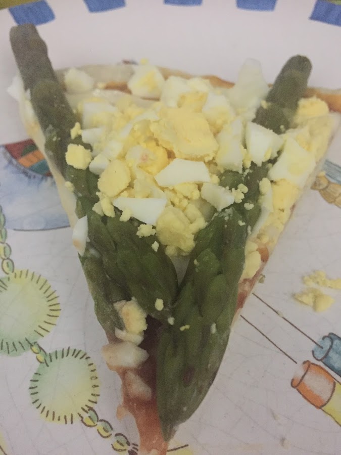 Una vez afuera distribuís los espárragos con la punta en el centro y arriba el queso.