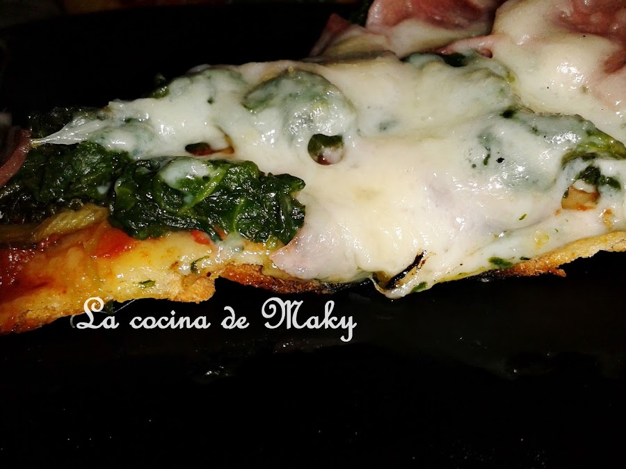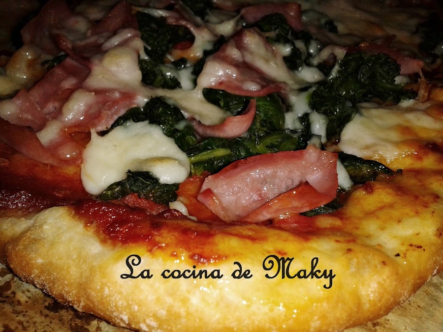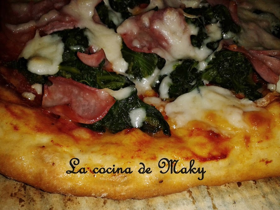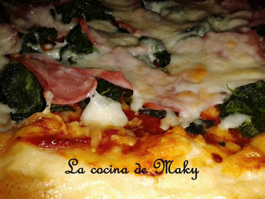 Cogemos una bola de masa y en una superficie espolvoreada con harina la vamos aplastando con la mano desde el centro hasta las esquinas hasta que la tengamos del grosor que nos guste (a nosotros finita) y colocamos sobre un papel de horno, pincelamos los bordes con aceite de oliva y el resto lo untamos con tomate y ponemos orégano (se puede poner también una vez horneada) colocamos las espinacas por encima, el jamón cocido y por último la mozzarela (u otro queso) y llevamos al horno, en este momento le dejamos calor solo por abajo y colocamos en el suelo del horno (si, habéis leído bien, en el suelo, nos ayudamos de una bandeja sin bordes o con un cartón gordo) y dejamos hasta que esté tostadita (unos 5 minutillos). En ese momento cogemos la pizza y la pondremos en la bandeja del horno y la colocaremos en el medio con calor arriba y abajo (ahí yo aprovecho para meter la otra en el suelo del horno) hasta que se esté el queso fundido y los bordes tostaditos.