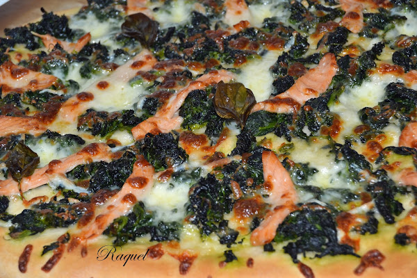 Hoy es viernes y toca pizza hoy os traigo esta nueva versión en el blog, esta lleva ya tiempo pendiente de publicar con las fotos esperando en una carpeta de mi Pc y creo que hoy puede ser perfecta verdad, a quien no le apetece una pizza en fin de semana ? por cierto esta no tiene muchas calorías, es de espinacas y salmón ahumado espero que os guste, a nosotros en casa si nos gusto pero no nos dimos casi cuenta hasta que quedaban dos trozos de que se me había olvidado algo, si sabéis el que ? pues ponerle tomate sobre la base, pero aun así sin el estaba muy rica, si os animáis a hacerla, la podéis hacer con o sin como mas os guste y me lo contais.