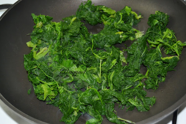 Salteamos en una sartén con un poco de aceite, las espinacas limpias y troceadas, durante unos minutos.