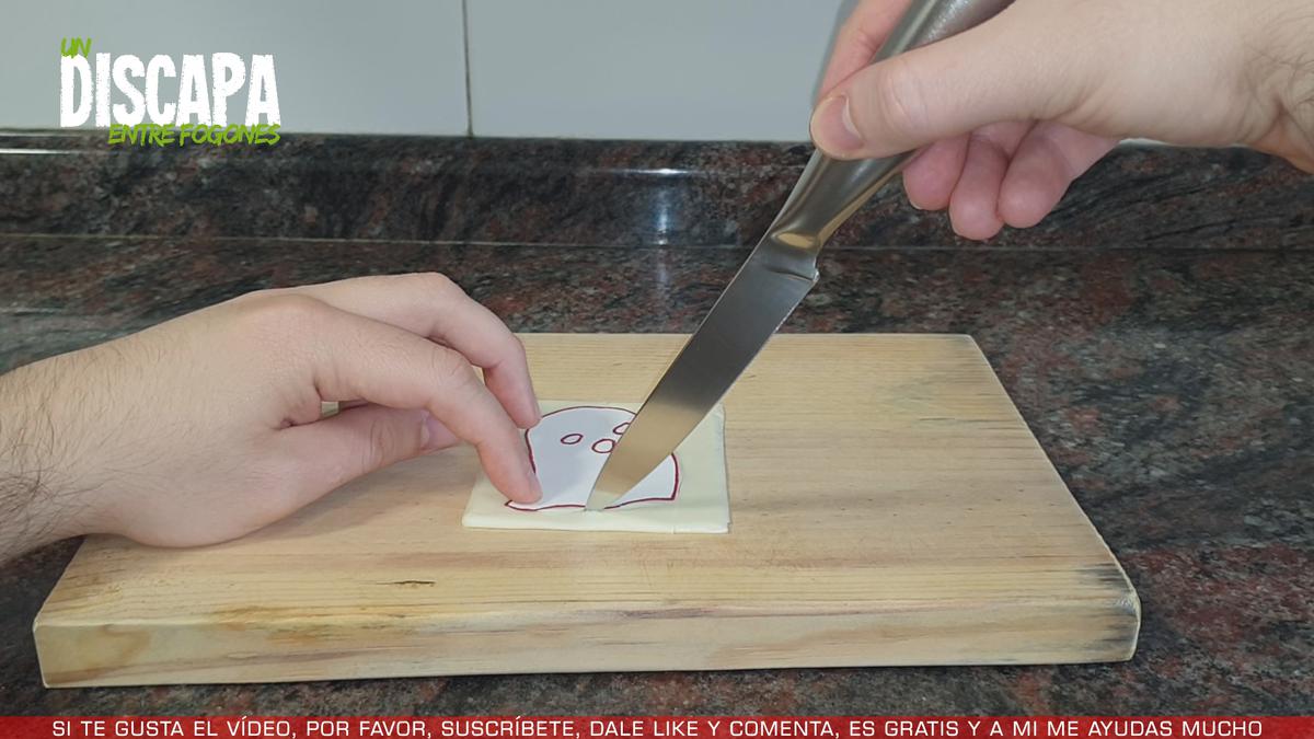 4Aquí tengo unas figuras de fantasmas recortadas. Lo que haremos será poner una loncha de queso en una tabla, ponemos encima del queso la figura del fantasma y con un cuchillo recortamos la silueta del fantasma, retiramos el queso sobrante y colocamos la silueta en la pizza.