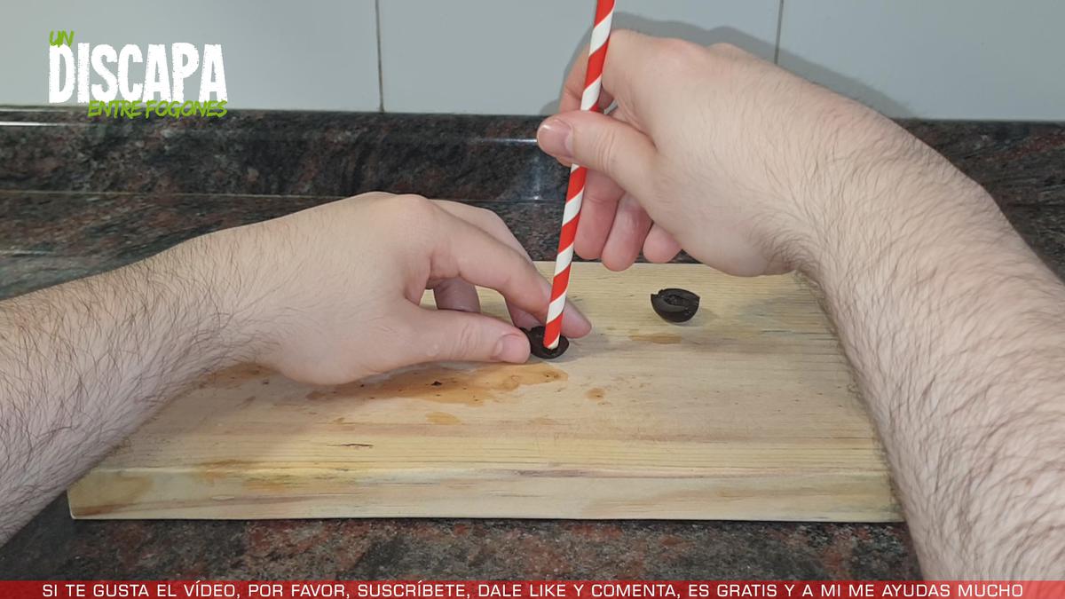 5Ahora vamos a hacer los ojos a los fantasmas, para ello, cortamos una aceituna por la mitad a lo largo y con la ayuda de una pajita hacemos una presión sobre la aceituna para sacar unos pequeños círculos. Colocamos esos pequeños círculos en las siluetas de los fantasmas para simular los ojos.