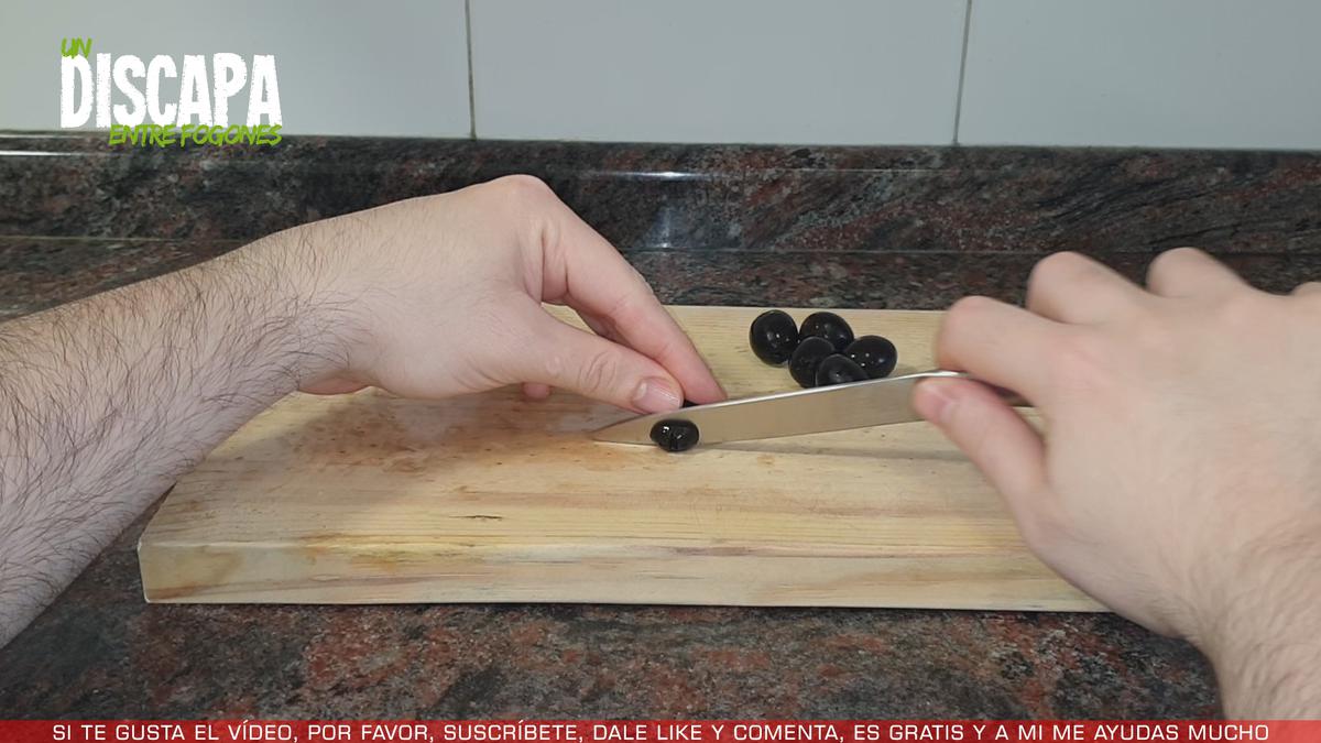 6Ahora vamos a hacer la boca a nuestros fantasmas, para ello, cortamos el extremo de la aceituna donde no tiene el agujero. Y se la colocamos a los fantasmas.