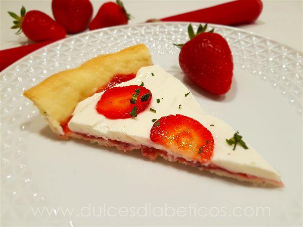 1 lámina de masa quebrada/brisa redonda, 200gr de queso crema light, 2 láminas/hojas de gelatina neutra, 1 cucharada de stevia/ 2 de sucralosa, Mermelada de fresa (o 300gr de fresas para hacerla), 3 fresas para decorar, Hojas de hierbabuena o menta