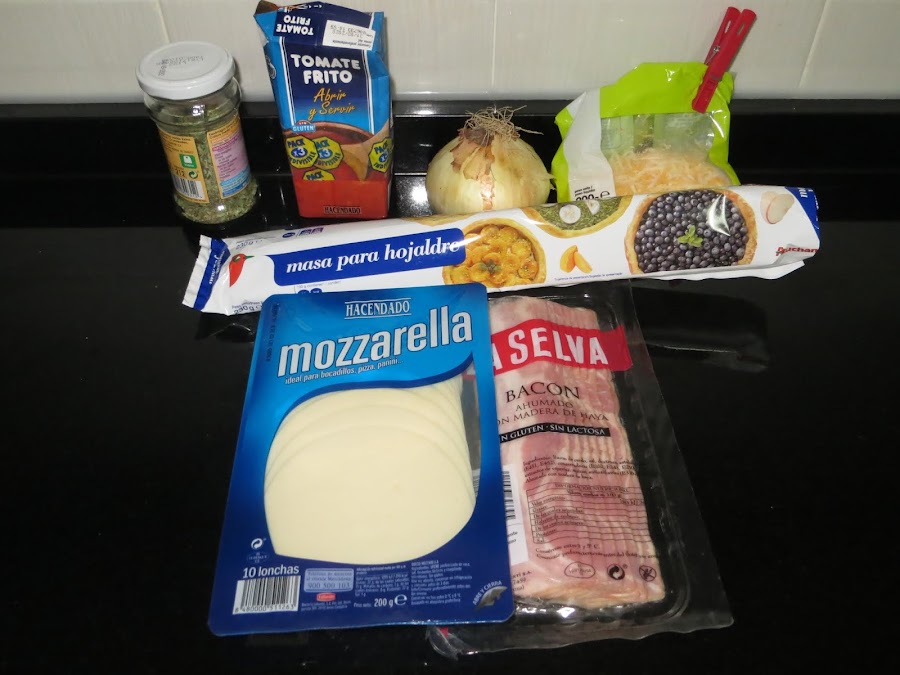 Estiramos en una superficie lisa la lámina de hojaldre, la colocamos con un papel de horno en la bandeja y pinchamos la masa con un tenedor para que no nos suba en el horno. Encima echamos el tomate frito, el queso rallado y colocamos las lonchas de queso mozzarella, la verdad es que podéis emplear el queso que más os guste, pero os recomiendo el queso mozzarella en lonchas, porque contra más lo pruebo al horno más me gusta.