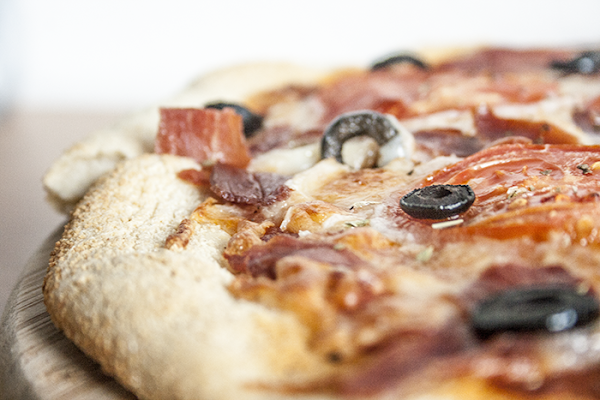 Sacamos la masa del horno y cubrimos con el queso rallado, el tomate en rodajas, el jamón cortado en trozos pequeños y las aceitunas negras laminadas. Horneamos otros 5-10 minutos hasta que la masa coja color y el queso se funda.