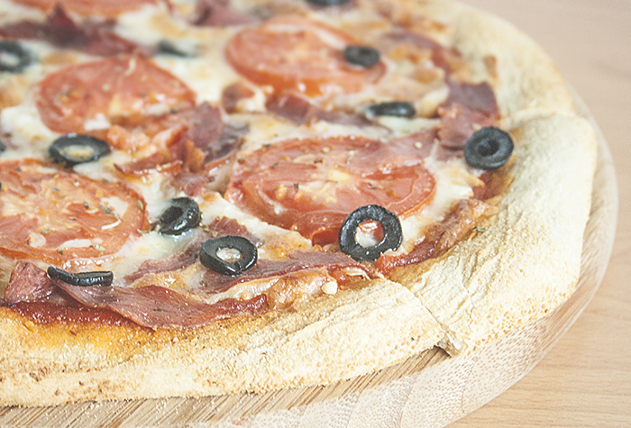 Estiramos bien la masa con ayuda de la sémola de trigo, la ponemos sobre nuestra base y extendemos salsa de tomate por la superficie. Hacemos un pre-horneado durante 5-10 minutos en la zona baja del horno con ventilador abajo hasta que el tomate deje de estar brillante.