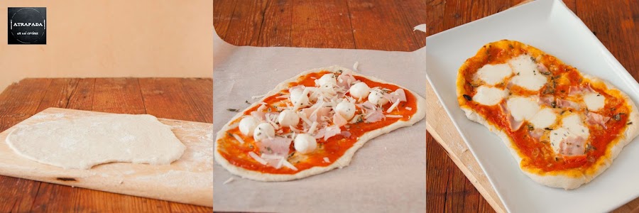 Mientras la masa hace su trabajo nosotros iremos preparando la salsa de tomate. Pelamos los tomates y ponemos en un cazo a fuego lento (en caso de poner tomate triturado añadimos éste), junto con la cebolla pelada y cortada, la sal y las cucharadas de mantequilla. Dejamos cocinar a fuego bajo durante aproximadamente 45 minutos. En ese momento trituramos y dejamos espesar un poco la salsa, rectificamos de sal. Reservamos hasta su uso (lo que nos sobre lo metemos en un bote de cristal y lo guardamos en el frigorífico). Cuando las bolas de masa hayan doblado su volumen iremos preparando las pizzas (congelamos las que no vayáis a usar). De nuevo enharinamos la encimera y cogemos una de las bolas espolvoreamos harina y estiramos con el rodillo hasta dejar la masa bien finita. Cogemos con cuidado y pondremos sobre papel de hornear. Ésta primera pizza la hice para Laura, así que sólo le puse tomate, jamón cocido y queso mozzarela y grana padano y un poco de orégano. El horno lo tendremos encendido media hora antes a 250º. Ponemos sobre una bandeja de horno lisa, sin extremos, y dejamos caer el papel con la pizza sobre la base del horno, es decir, en ninguna de las rejilla, directamente en lo más bajo del horno. Cuando empiecen a dorarse los bordes, subimos a la última rejilla y gratinamos durante unos minutos, hasta que veamos que los ingredientes están hechos y el queso gratinado.