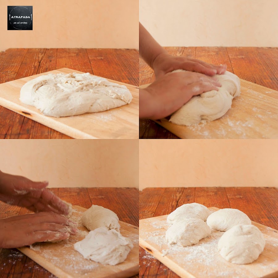 Empezaremos preparando la masa, para ello mezclamos las harinas y la sal. En un cuenco echaremos la levadura, el azúcar y el agua y dejaremos durante unos cinco minutos hasta que burbujee la mezcla. Agregamos el aceite de oliva y removemos. Vamos añadiendo poco a poco a la mezcla de harinas y amasaremos con el gancho de la amasadora en caso que lo hagamos con ella, también podemos amasar en la Thermomix o en la panificadora. Y si no disponéis de ninguno de estos aparatos lo que haréis será amasar a mano, aunque antes mezclaréis todos los ingredientes con un tenedor. Se trata de una masa muy pegajosa, por lo que si trabajáis a mano sobre la encimera tendréis que hacerlo con la encimera bien enharinada y amasar hasta que se convierta en una masa firme, aunque aún pegajosa. En la amasadora nuestro amasado durará unos diez minutos. Dividimos la masa en cuatro partes iguales y con cada una de ellas haremos una bola, pondremos en una bandeja de horno sobre papel de hornear y tapamos cada una con papel film aceitado y dejamos levar, hasta que doblen su volumen.