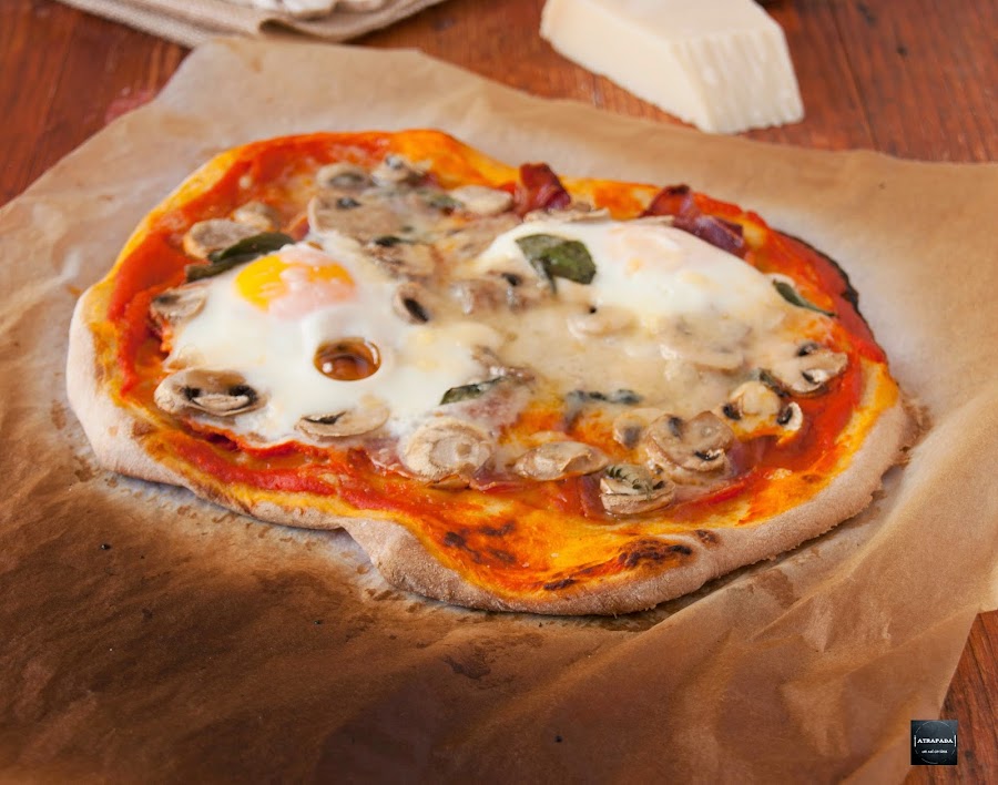 Hacemos lo mismo con la segunda pizza, en esta ocasión repartimos el tomate, añadimos las lonchas de jamón serrano, champiñones laminados y cascamos dos huevos, ponemos un poco de sal a los huevos. Añadimos unas hojas de albahaca y un poco de queso grana padano. Dejamos caer la pizza en el papel vegetal sobre la base del horno, con mucho cuidado de que los huevos no nos vayan a bailar. De nuevo cuando esté dorada, pasaremos a una bandeja superior y gratinamos hasta que el queso se haya gratinado y el resto de ingredientes se vean hechos.