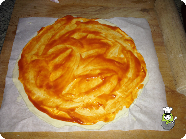 Preparamos la masa de la pizza y la estiramos bastante fina. A continuación, colocamos la capa de la salsa de tomate casera que hemos preparado.