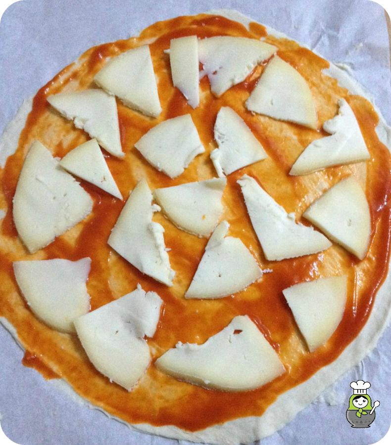 Cortamos pequeños trozos de queso tetilla y los colocamos sobre la pizza.