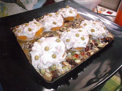 Distribuimos sobre ella el mix de semillas variadas y sobre ellas colocamos los melocotones, con la parte donde contenían la semilla hacia arriba.