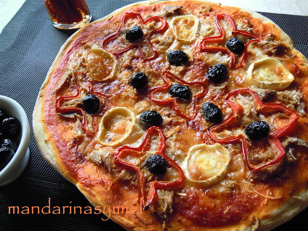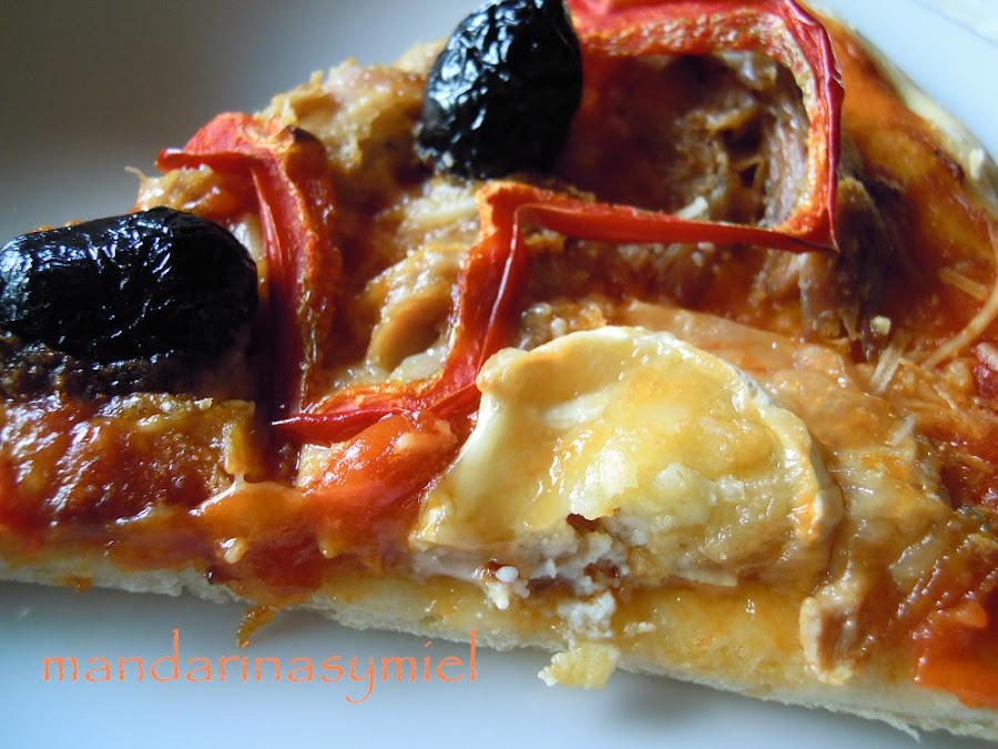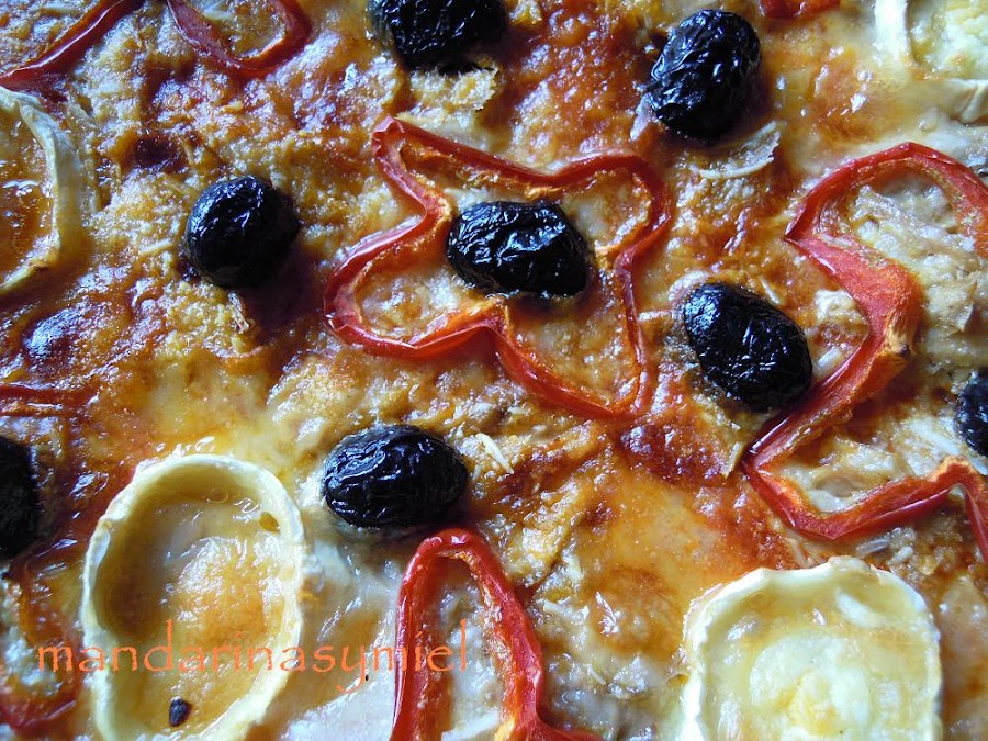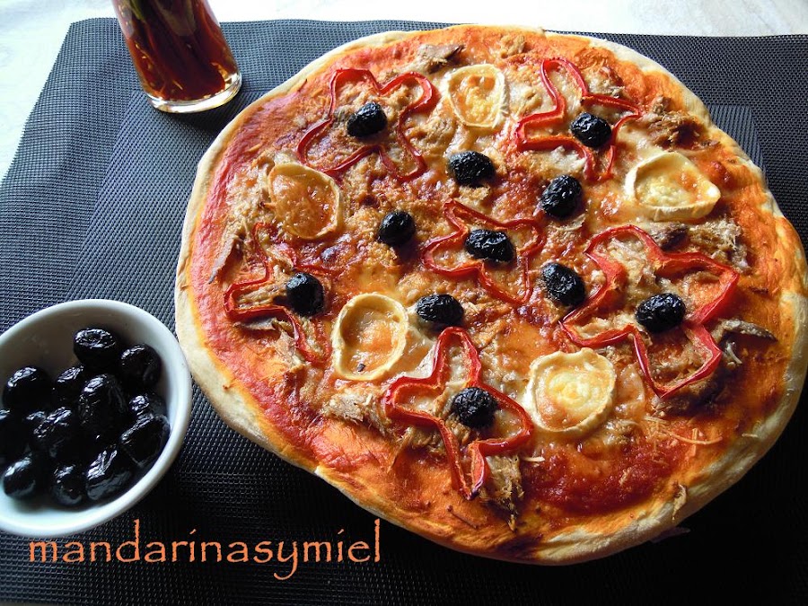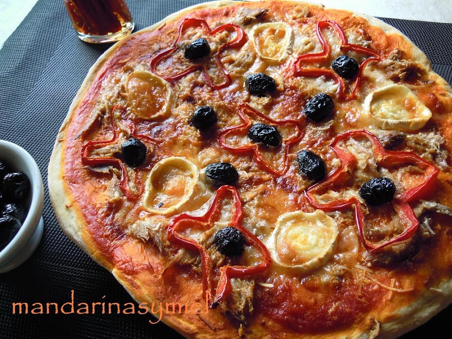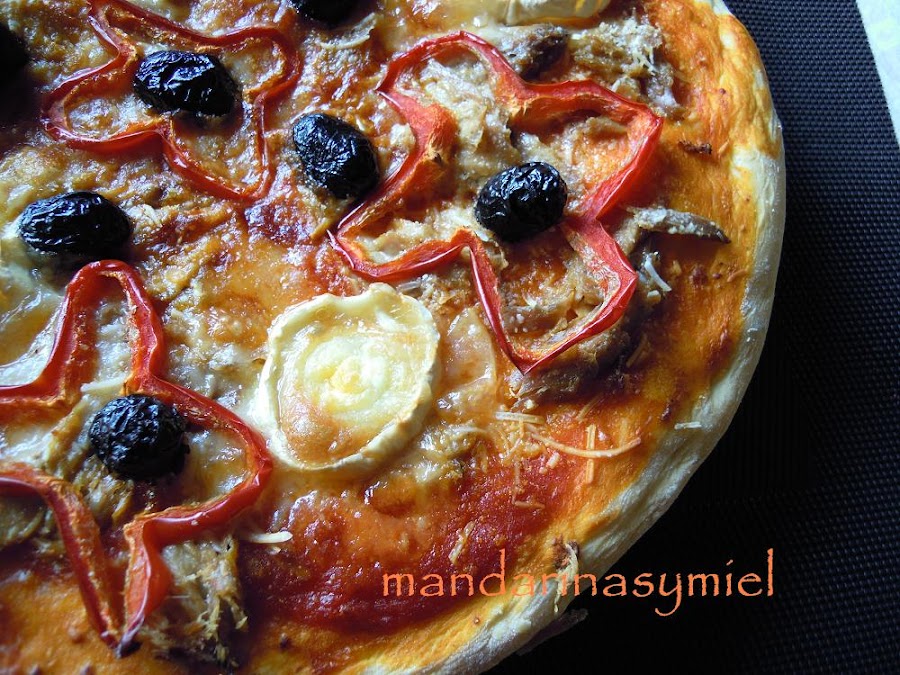 Esta pizza la he hecho con melva en vez de bonito, porque es un pescado que me encanta. Es un pescado de verano, un pescado azul de la familia de los bonitos y atunes, pero de pequeño tamaño; se pesca principalmente, entre los meses de junio y octubre, y es rico en omega3, proteínas, magnesio, fósforo...