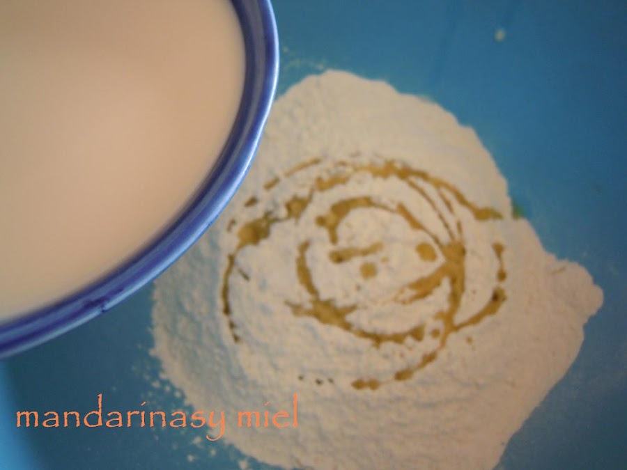 Calienta un poco la leche y deshaz en ella la levadura. Añade la leche a la harina, mezcla bien.