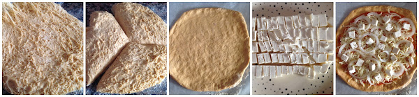 Cubrimos con tomate frito a gusto y ponemos la mozzarella rallada, la cebolla cortada en aros, el queso feta y orégano. Ponemos el papel vegetal con la pizza encima, sobre la bandeja que está dentro del horno, teniendo cuidado de no quemarnos y cocinamos a 250º durante 12 minutos aproximadamente o hasta que veamos que la pizza está dorada.