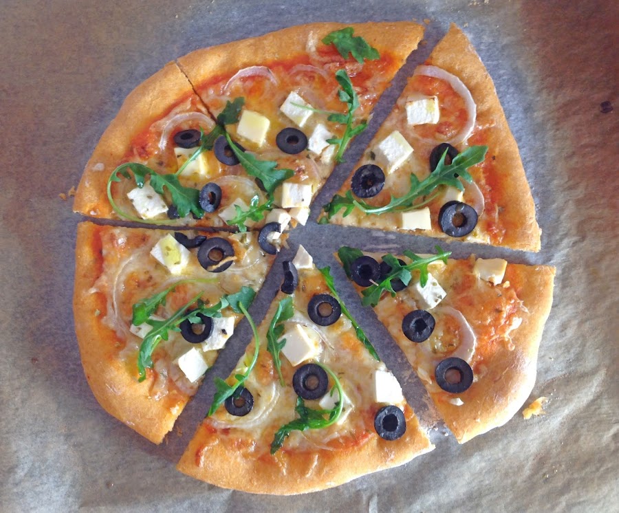 Retiramos la pizza del horno y decoramos con aceitunas negras troceadas, hojas de rúcula y un chorrito de aceite de oliva...mmm.