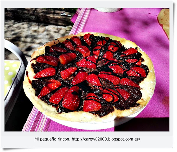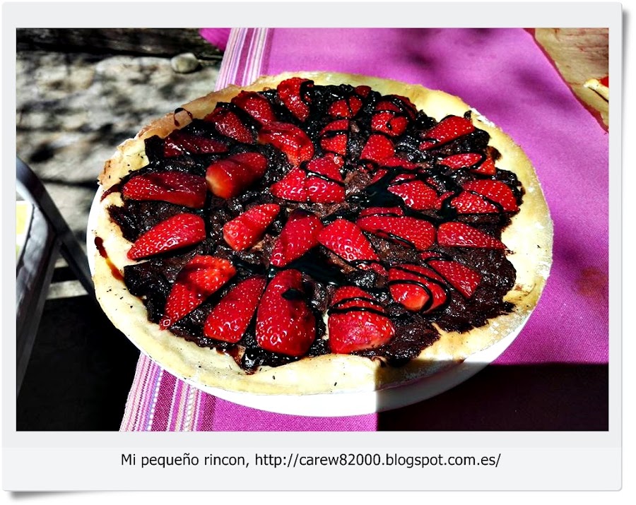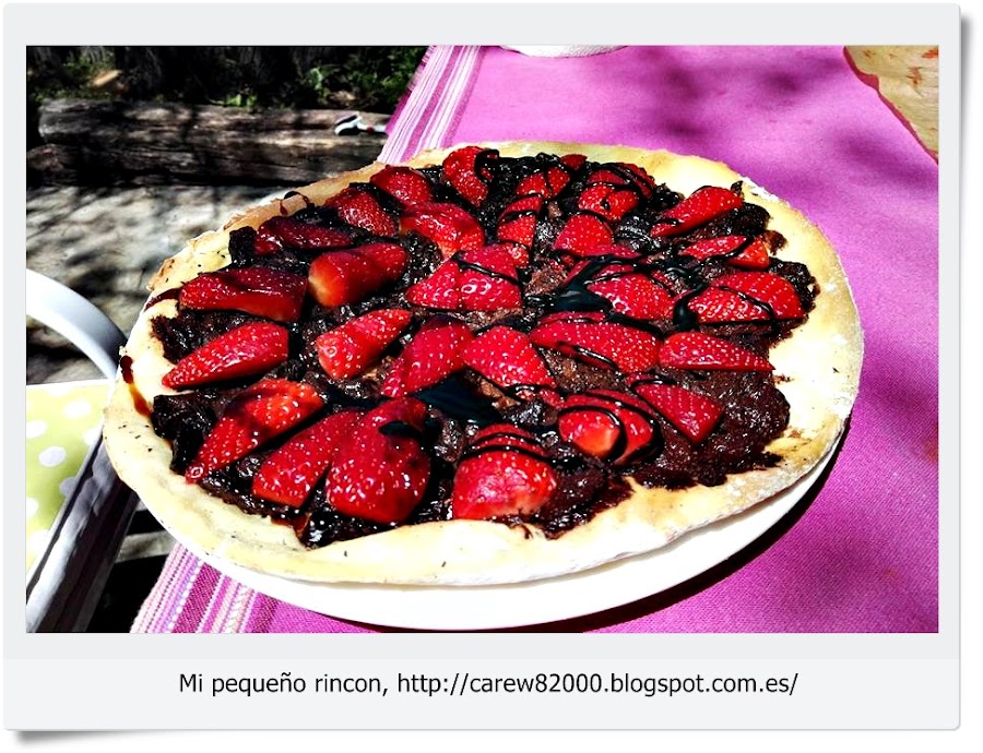 Una vez colocada sobre la superficie que pondremos en el horno, le añadimos la nuttela por toda la base y horneamos, cuando la base adquiera un tono tostadito retiramos del horno y volvemos a poner otra capa de nuttela, y por ultimo cubrimos con las fresas troceadas.