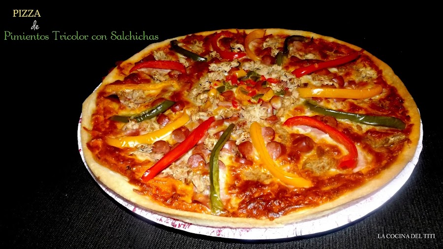 Hola a todos, muchos de ustedes estais de vacaciones y para mi es todo lo contrario pues es cuando mas trabajo y por eso queria haceros una cena de familia con una rica Pizza con tres variedades de Pimientos y unas Salchichas franfurk y como siempre cada vez que las hago en mi blog preparada con una buena masa de pizza casera.