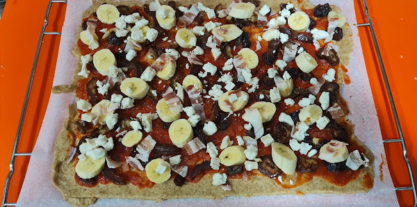 Ración de pizza de plátano, dátiles, bacón y rulo de cabra