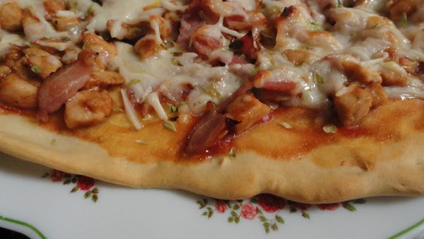 Cortamos la pechuga de pollo en cuadraditos pequeños.Ponemos el aceite a calentar y doramos bien el pollo, cuando esté doradito echamos la salsa barbacoa y que quede todo bien impregnado, damos unas vueltas y reservamos. Pasamos una sartén al fuego sin nada de aceite y ponemos un poco el bacon para desgrasarlo en lo posible. Y lo cortamos en cuadraditos. Ponemos sobre la base las dos cucharadas de ketchup y colocamos por encima los trocitos de pollo, los de bacon, y cubrimos con el queso rallado. Ponemos al horno hasta que estén doraditos los bordes.... y a comer.
