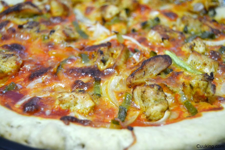 Podéis eliminar la salsa de tomate y en ese caso añadiríamos más nata (crema de leche) al pollo (para que la pizza tenga el punto jugoso)