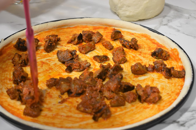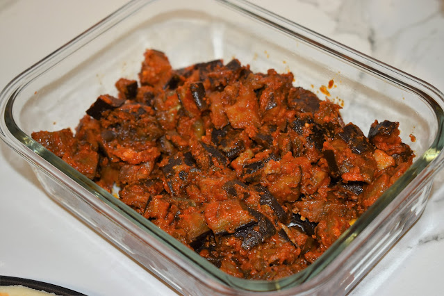El relleno de esta pizza es de aprovechamiento, porque hice unas berenjenas que daban vueltas por la nevera, que recordaban a las berenjenas a la Parmigiana y así se quedo con ese nombre, las puse sobre unas tostadas el día anterior para la cena.