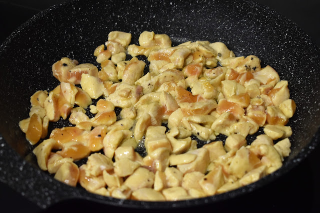 Pon en una sarten con un poco de aceite y saltea el pollo, añade sal y pimienta, una vez hecho reserva en un plato.