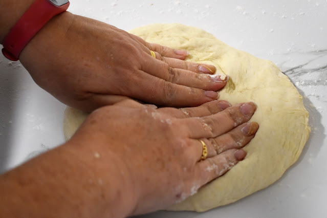 Después de ese tiempo habrá doblado su volumen, echamos un poco de harina encima del mármol y ahora toca ya amasar con las manos durante unos minutos para que expulse los gases de la levadura.