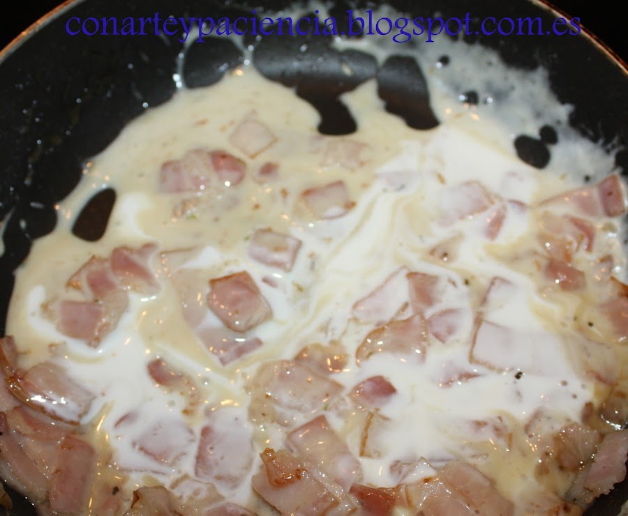 Sofreímos dos minutos el beicon incorporamos una cucharada de miel y otro chorreón igual de nata (crema de leche).