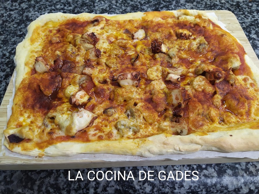 Aove. Estiramos la masa, y le añadimos la salsa de tomate, los champiñones, el pulpo troceado y el queso, metemos al horno precalentado 200°, hasta que el queso este dorado.