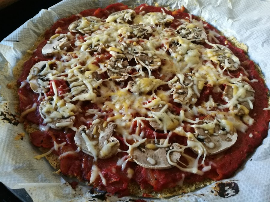 - Extendemos el tomate sobre la base de quinoa, colocamos los champiñones, esparcimos el queso rallado, y salpimentamos. Volvemos a llevar al horno 10 minutos y ya está lista para comer!!