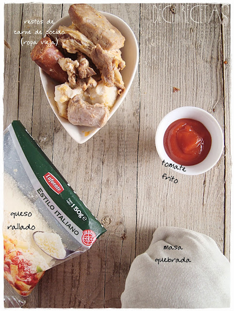 Estiramos la masa quebrada (receta aquí) que hice casera y ponemos encima los restos del cocido triturados, en mi caso en la Thermomix. Por último, añadimos tomate frito y queso rallado. Metemos al horno a 180 grados por 20-25 minutos a media altura