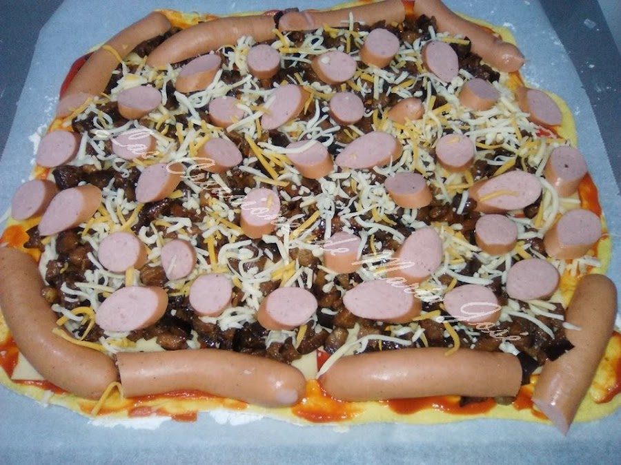 En casa nos encanta la pizza de berenjenas, pero esta vez le añadí unas salchichas ¡¡ESTABA DELICIOSA!! espero que la hagáis y me contéis si os gusto.