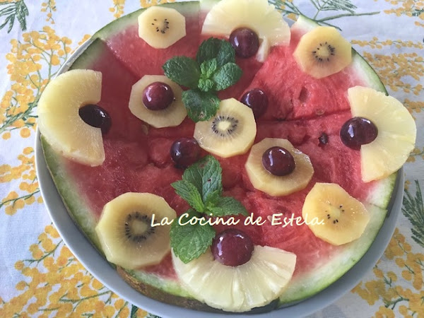 Cortamos la sandia en triángulos dejando la piel y vamos decorando nuestra pizza por encima con las frutas y detalles que mas te guste y tengas en ese momento. A tus invitados les encantara.