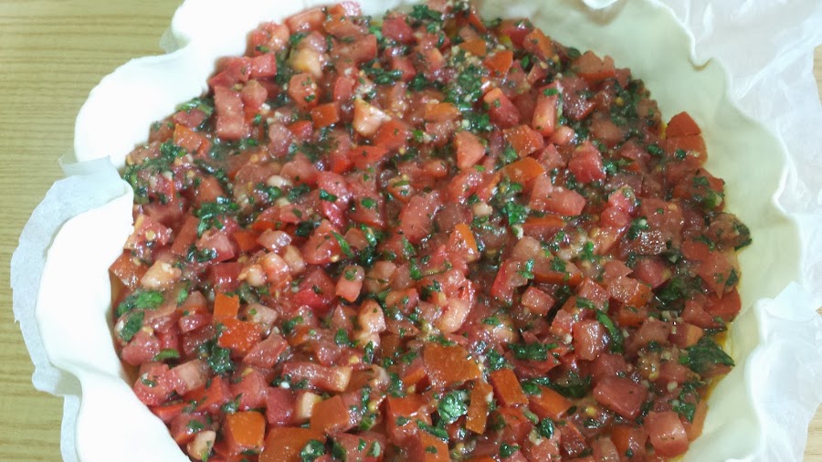 Picamos la albahaca y los ajos y mezclamos con los tomates. Añadimos un chorrito de aceite, sal y repartimos sobre la pizza.